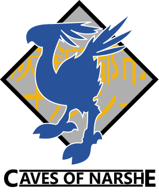 Without going too far into the genesis of the original logo, it leveraged aspects of the Final Fantasy series itself, remixed to become an identifiable icon of Caves of Narshe. The original logo, debuting in 2007, featured an illustration of the series' iconic chocobo (a large, usually-flightless, often yellow bird in the vein of an ostrich) over a diamond shape similar to the logo of the Shinra company, a fictional megacorporation from the series' seventh flagship entry. While Shinra includes its name in the diamond in Japanese katakana, for CoN we included instead katakana reading "Colliery Town Narshe," noting that Narshe is a coal-mining town in Final Fantasy VI, from whence the site got its name. The logo started out as a colorful and flat piece, matching a proposed new design that never really materialized; as the logo was modified to better suit the designs that were public facing, the logo ended up adding depth while sometimes still dropping color.